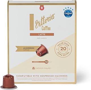 Vittoria Latte 100% Arabica Nespresso Compatible Aluminium Coffee Capsules. Best Served with Milk - 20 Pack Pods. Milk chocolate, caramel, toffee tasting notes. |