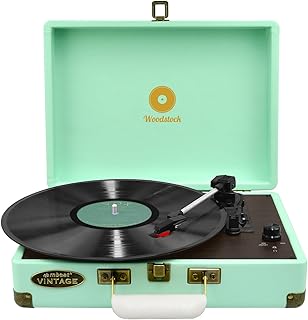 mbeat Woodstock Retro Briefcase Turntable Record Player Built-in Speakers 3 Speed Play - Aqua Blue Colour |