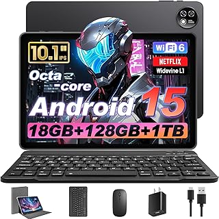 Android Tablet 10 Inch Tablet Android 15 Tablets, Octa-Core, 18GB RAM+128GB ROM+1TB Expand, 1280x800 FHD IPS Display, GPS, Widevine L1, 6000mAh, 5MP+8MP Camera, 5G+2.4G Wi-Fi, Bluetooth 5.4, Black |