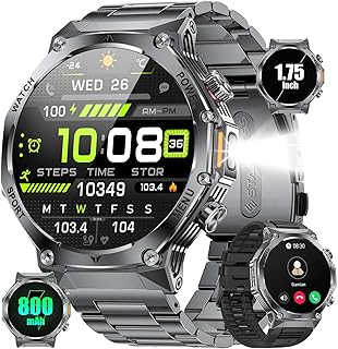 Mingtawn Military Smart Watch for Men (Answer/Make Call), 1,85" HD Touch Screen 700mAh Large Battery Fitness Watch with Flashlight/Sleep Monitor Fitness Tracker for iPhone & Android Black Steel Strip |